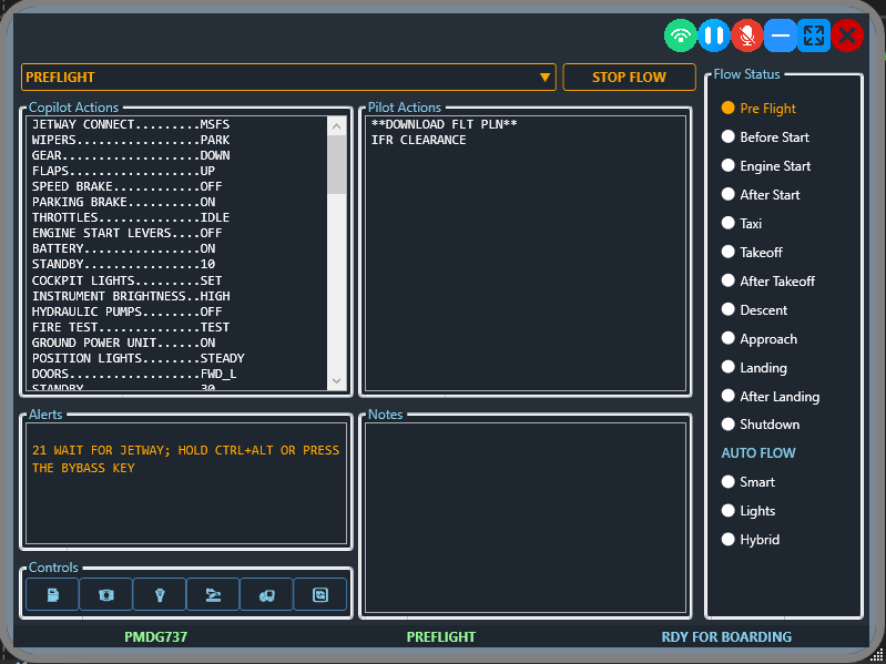 When a flow is activated, the copilot verifies every relevant system for the current phase (e.g., Pre-Flight, Taxi, Takeoff, Approach). If something isn’t set per the aircraft manufacturer’s guidance, the copilot sets it correctly for you—no 300-page manual required.